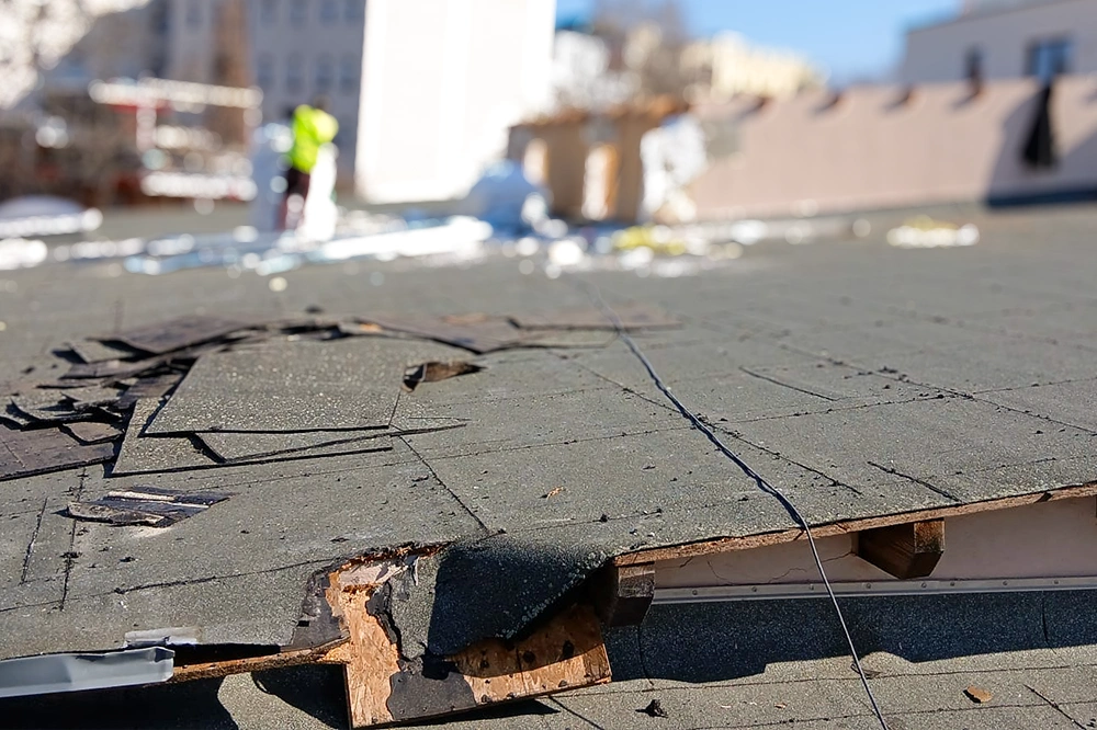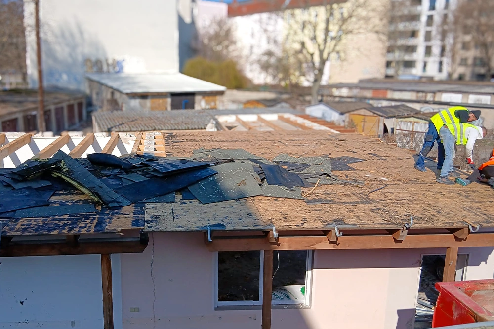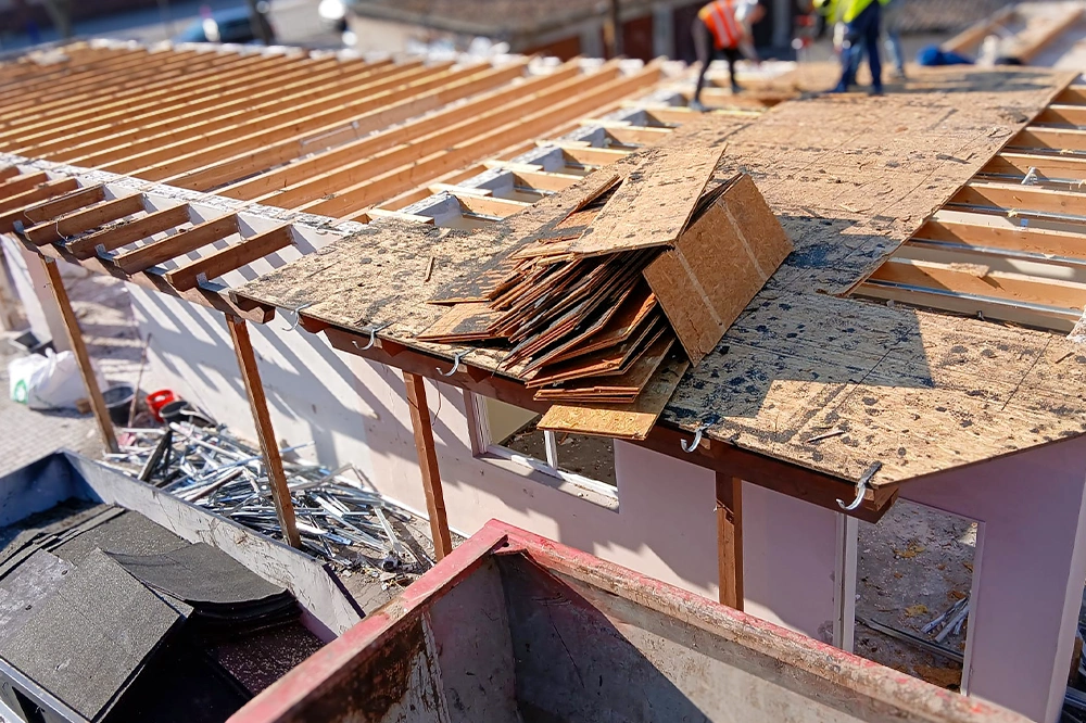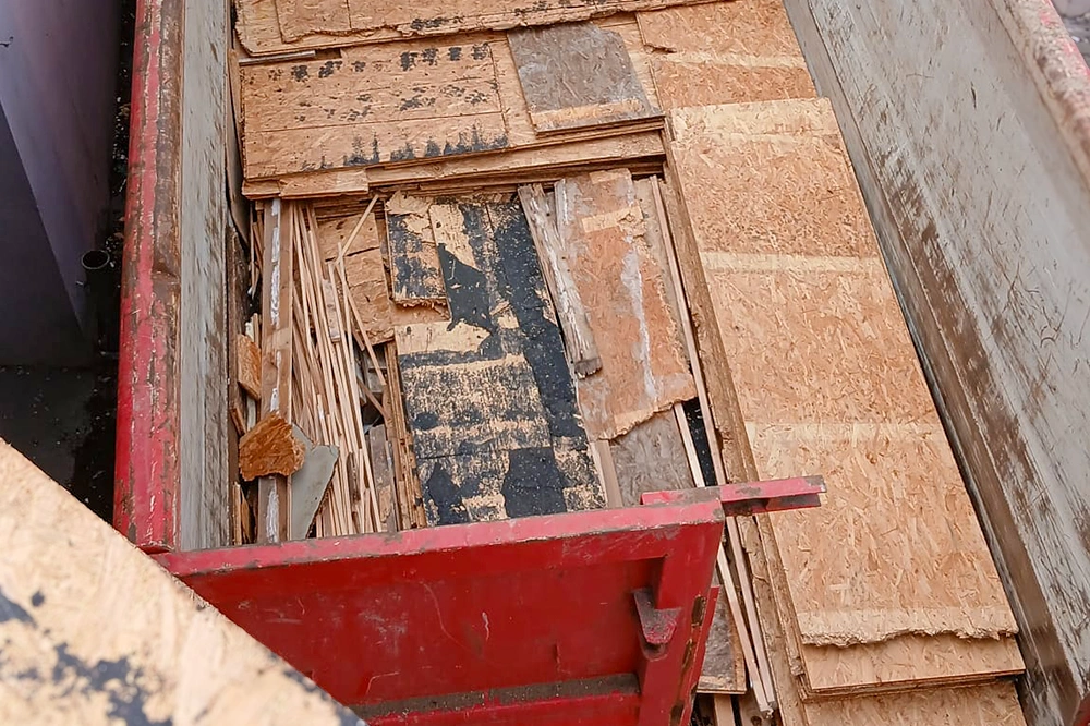 Abtragen der Dachaufbauten und der Dachabdichtung (Bitumen/Dachpappe). Übergabe in geeigneten Behältern/BigBags bzw. Containern und Abtransport entsprechend Entsorgungsweg.