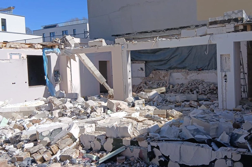 Dort, wo Maschineneinsatz zu riskant war, erfolgte der Rückbau abschnittsweise händisch (selektives Herauslösen/Abtragen), um Erschütterungen und Beschädigungen am Nachbargebäude zu vermeiden.