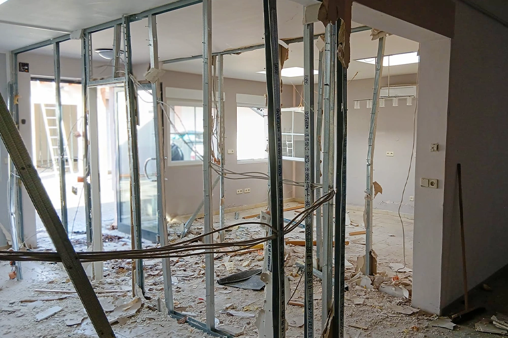 Rückbau (Entkernung) von nichttragenden Bauteilen und Innenausbauten: leichte Trennwände, abgehängte Decken, Verkleidungen, Einbauten sowie Bodenaufbauten. Parallel dazu laufende Vorsortierung in definierte Fraktionen (z. B. Gips, Kunststoffe, Holz, gemischt).