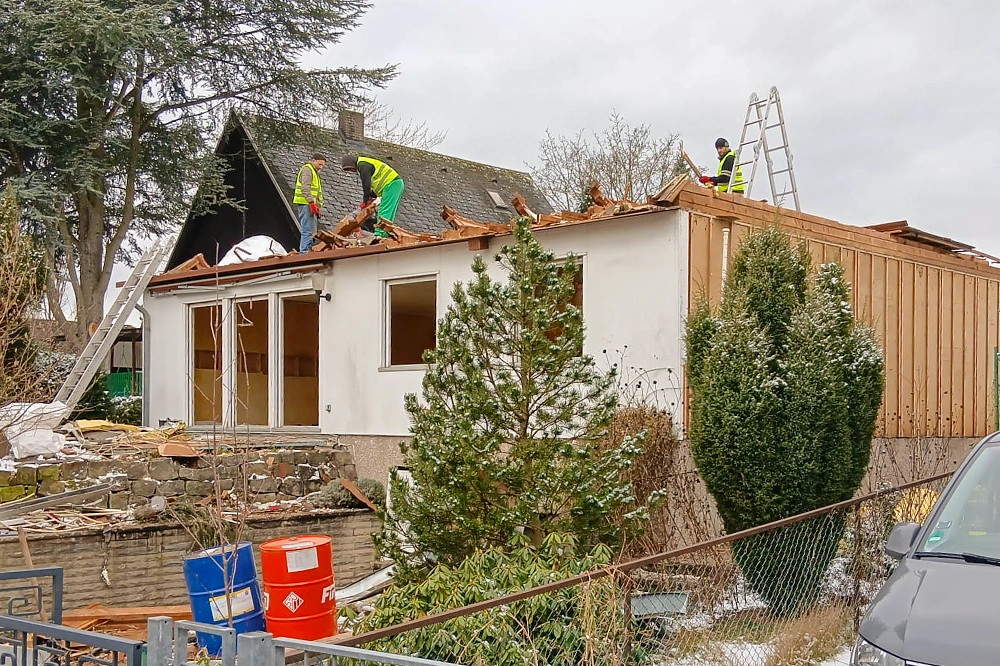 Die Besonderheit lag in der Kombination aus Handrückbau und Schadstoffsanierung – und das unter winterlichen Bedingungen (Schnee). Parallel mussten mehrere belastete Bauteile sicher entfernt werden: asbesthaltige Fassadenbauteile, Mineralwolle (im gesamten Dachstuhl, in Wänden und unter Bodenbelägen) sowie asbesthaltiger Schwarzasbestkleber, der im BT-Verfahren im Schwarzbereich entfernt wurde.